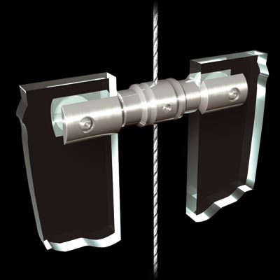 Uchwyty do krawędziowego mocowania szyldów o grubości do 8 mm między linkami stalowymi o średnicy 1.5 do 2 mm.